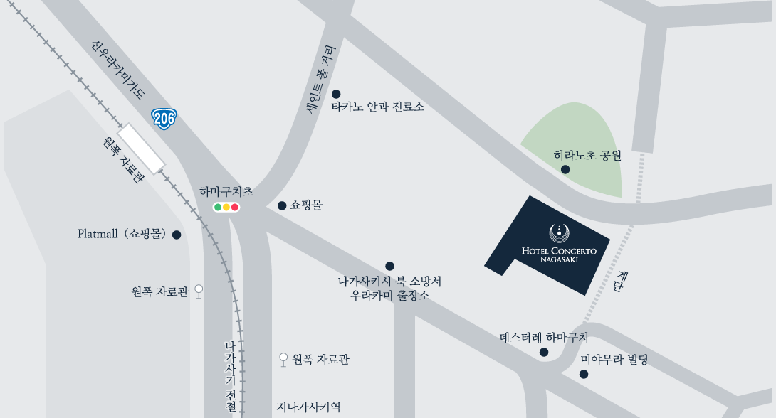・평화 공원 버스 정류장에서 우라카미 가도를 평화 공원을 왼손으로 보면서 걸어, 하마구치 신호 교차점을 좌회전해 주세요.